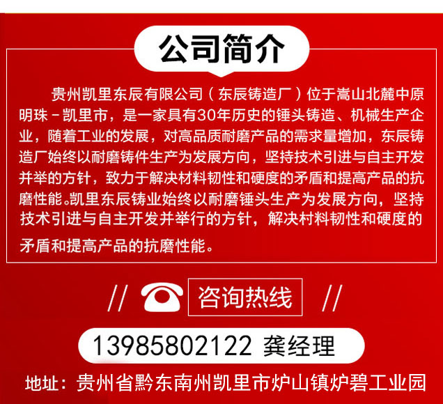 行業新聞 您所在的位置:首頁 > 新聞中心 > 行業新聞>貴州哪個耐磨錘頭廠家好-凱里東辰當仁不讓